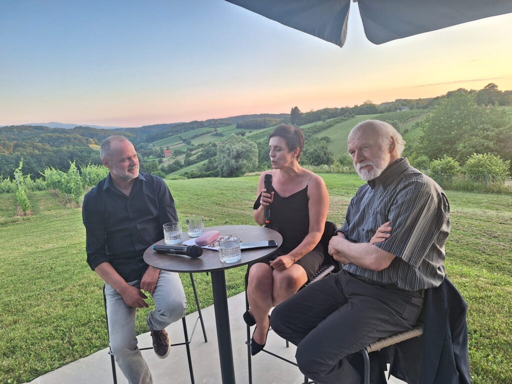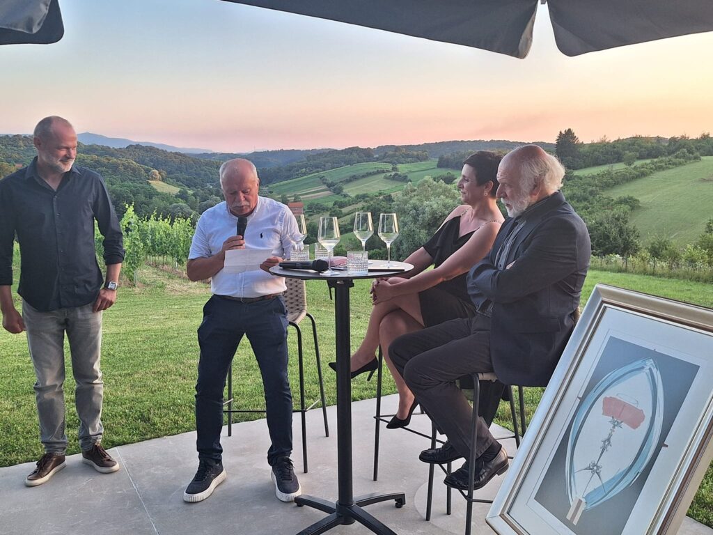 U razgovoru s Popovićem, čije se stvaranje događanja više od pola stoljeća i koji je kroz svoja djela, bilo književna, bilo ona likovna, sakralne i svjetovne tematike, ovim temama posvetio godine kontemplacije i razrade, uživali su birani uzvanici, prijatelji umjetnosti i vina.
